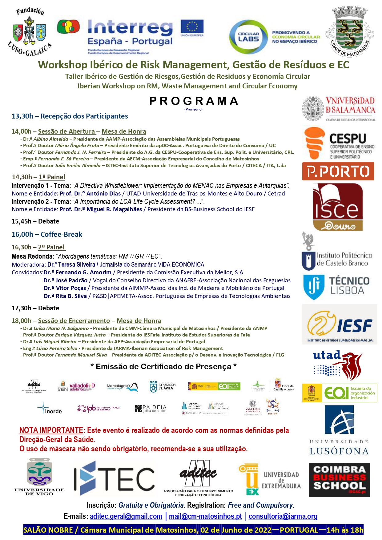 No próximo dia 2 de junho, a Associação Empresarial do Concelho de Matosinhos estará presente no workshop ibérico de risk management, gestão de resíduos e economia circular que decorrerá no Salão Nobre da Câmara Municipal de Matosinhos, entre as 14h e as 18h. A sessão de abertura contará com a participação do Presidente da AECM, Fernando Sá Pereira.